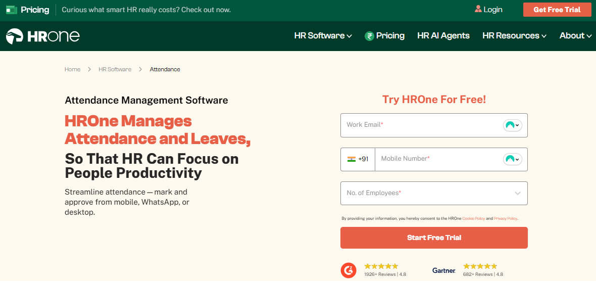 HRone is a cloud-based HR platform trusted by over 2,000 brands across India. It handles everything from attendance tracking to payroll processing. Companies use it to manage their entire employee lifecycle in one place. The platform works well for businesses of all sizes. Startups like how easy it is to customize and get started with. Enterprises appreciate the comprehensive features that cover 127 HR processes.Â