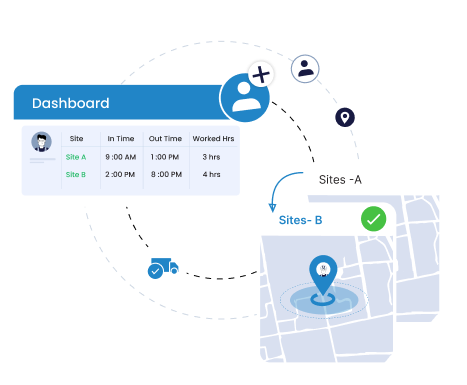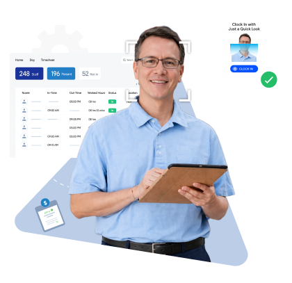 Employees clock in on shared mobiles or tablets with face recognition at entry, so attendance is tied to the right person at the right location instead of sign-in sheets, shared IDs.